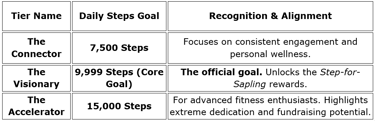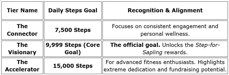 For every month a participant successfully achieves the 9,999 Steps (Visionary) Goal every single day of that month, the WRRIC Arokkiyam Foundation will sponsor the planting of one sapling.