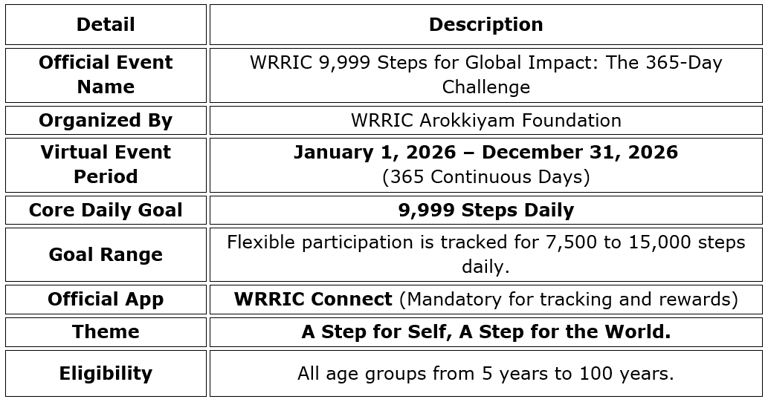 · By participating, you grant the WRRIC Arokkiyam Foundation and WRRIC Connect a perpetual, royalty-free license to use your name, likeness, and step data (aggregated and anonymized) for promotional, marketing, and statistical purposes related to the event and the NGO’s mission.